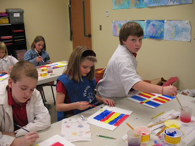 The students brought in canvases so we could reproduce this art. First they drew out their grid, which gave them a good lesson on horizontal, vertical and parallel lines. Then they needed to randomly paint their squares and rectangles. Once dry they needed to put in their black lines using electrical tape. Some are still working on that step.